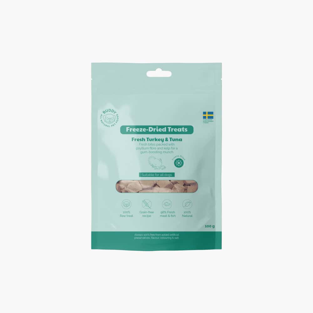 Buddy Freeze-Dried Treats sind gefriergetrocknete Hundeleckerlis und bestehen zu 96% aus frischem Fleisch und Fisch. Diese Leckerbissen aus nur einer Zutat sind so konzipiert, dass sie auch wählerischen Essern schmecken.