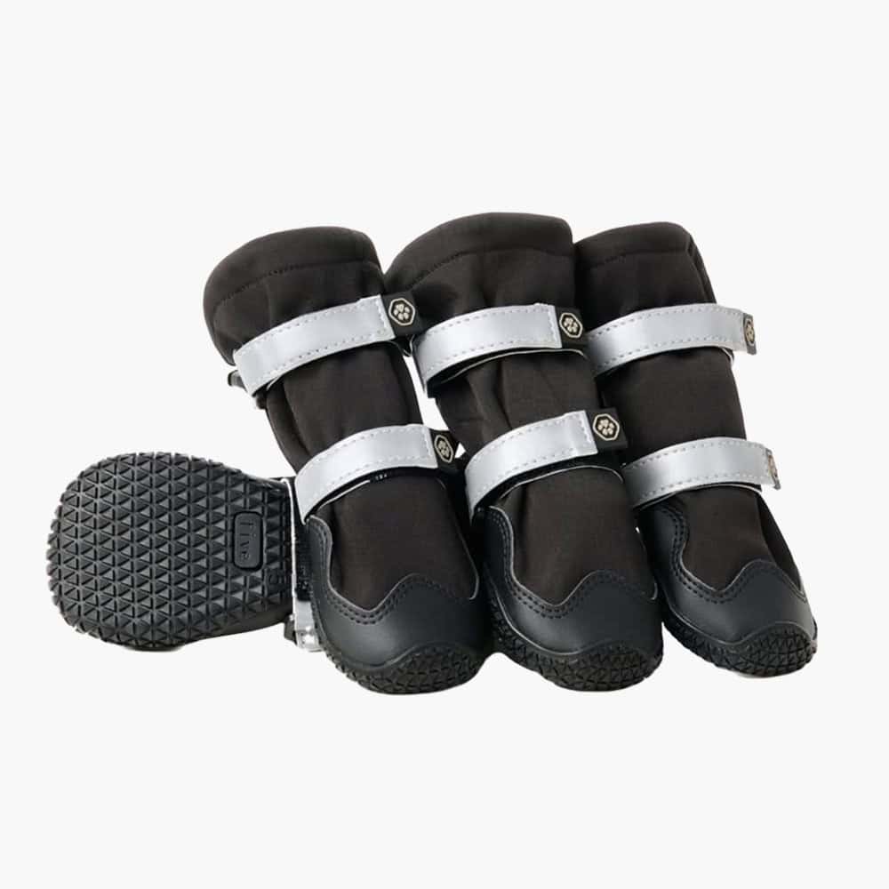 Doppelte Klettverschlüsse in Kombination mit einem verstellbaren Knebelverschluss sorgen für einen sicheren Sitz, der auch bei anstrengenden Spaziergängen an Ort und Stelle bleibt. Die robuste PVC-Gummisohle bietet hervorragenden Grip und schützt vor Verletzungen durch Schnee, Salz, scharfe Gegenstände und schädliche Chemikalien, die im Freien vorkommen.
