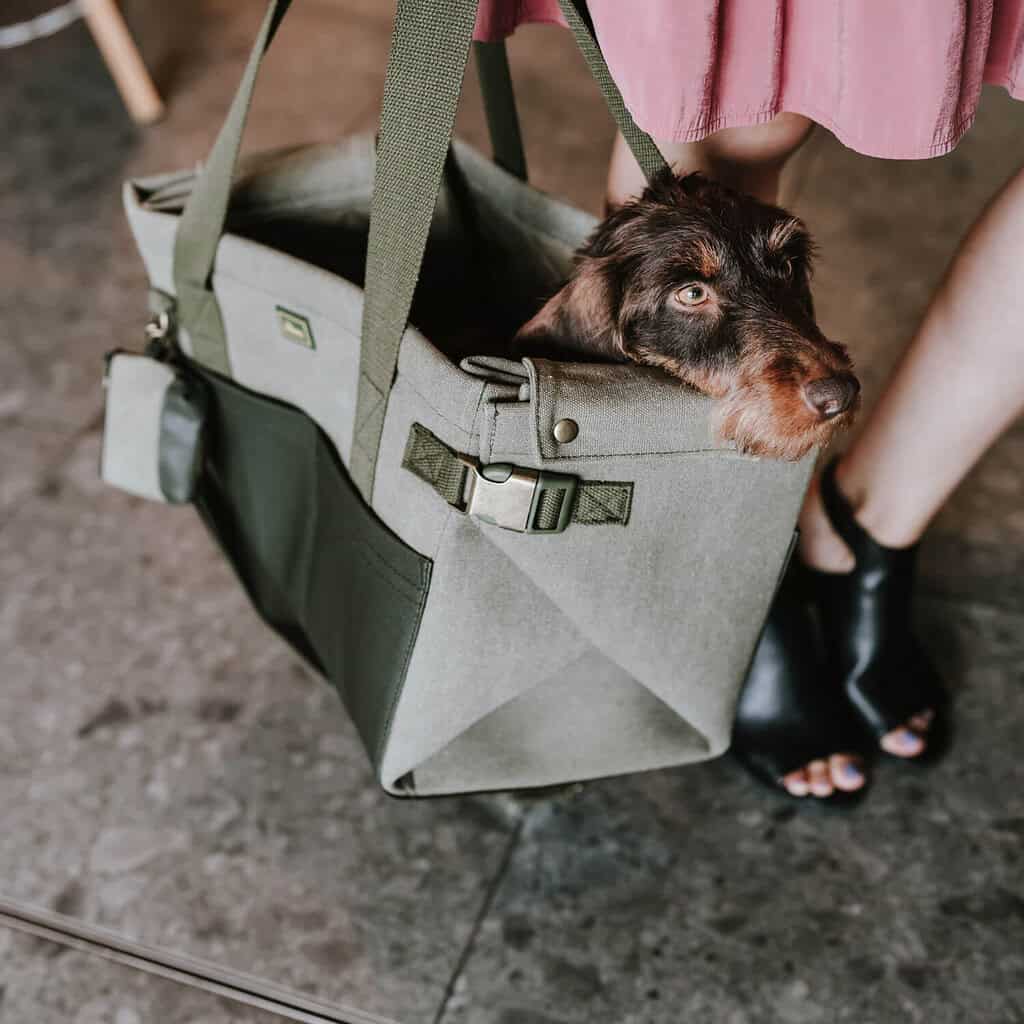 Polyester/Cotton, carabiner to secure the animal, can be folded out and used as a travel blanket, with dog waste bag carrier, with practical exterior pockets, with two carrying handles and individually adjustable, removable shoulder strap, max. load of 7 kg