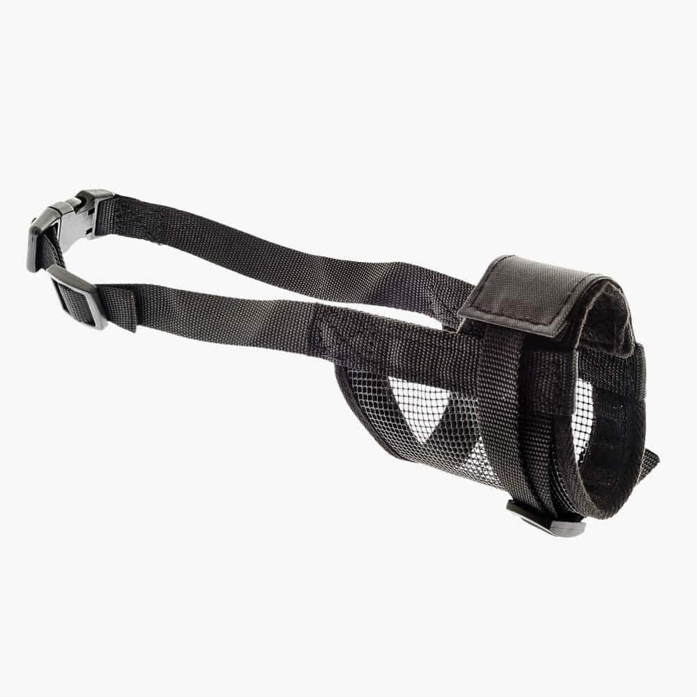 An adjustable muzzle is a safety device designed to prevent dogs from biting or nipping while still allowing them to pant, drink, and receive treats. It consists of a basket-like structure made of nylon.