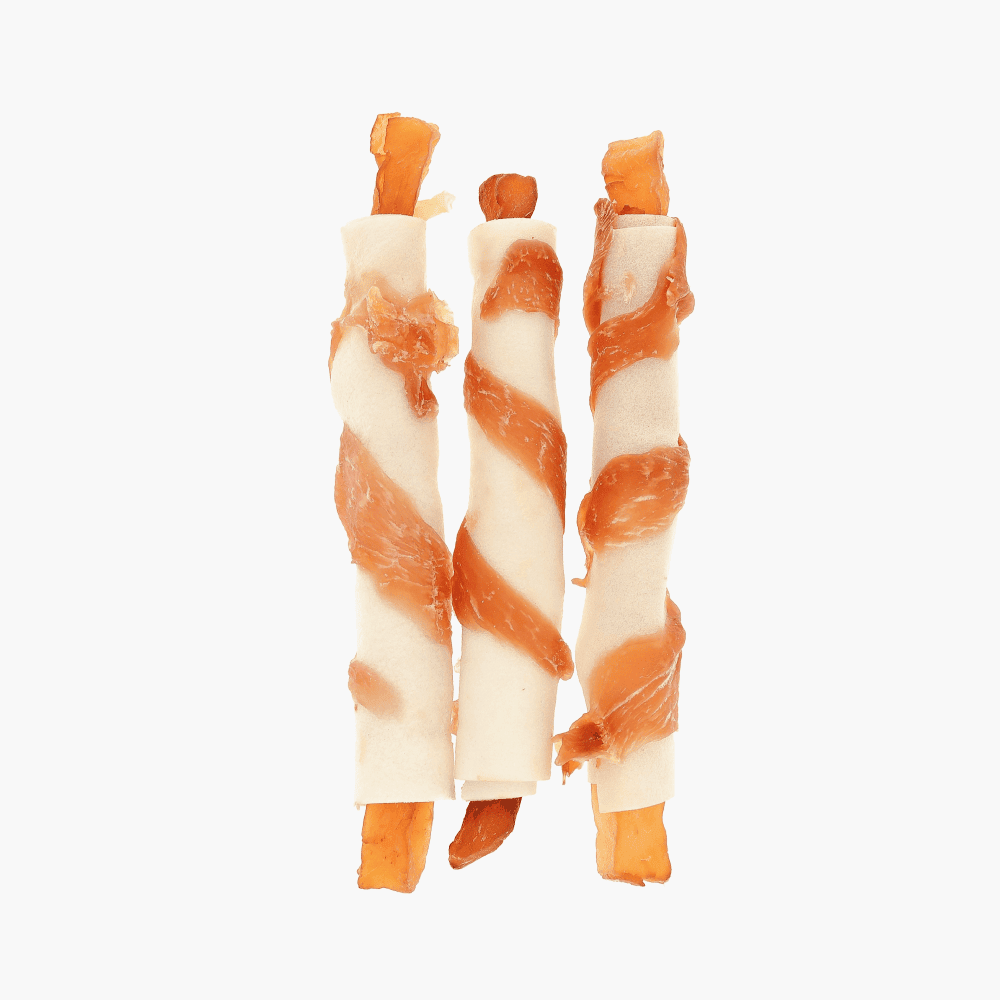 A dog treat made with potatoes and chicken, wrapped around a chewy bone twist. Perfect as a tasty reward or snack.
