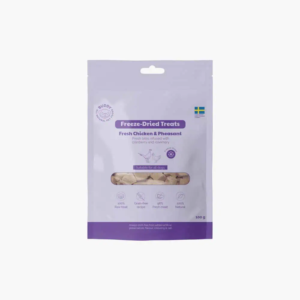 Buddy Freeze-Dried Treats are made with 96% fresh meat. These treats are designed to appeal even to picky eaters.