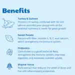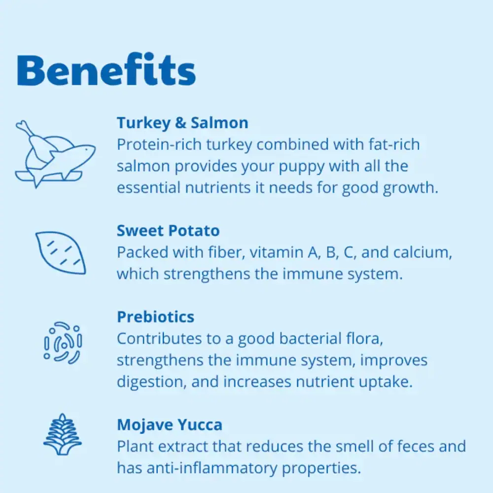 This complete puppy recipe is made with fresh turkey and wild-caught salmon (Fishing Area 27, between Scotland and Norway). It is rich in protein and fat to support growth, with balanced calcium and phosphorus levels for healthy bone and joint development.