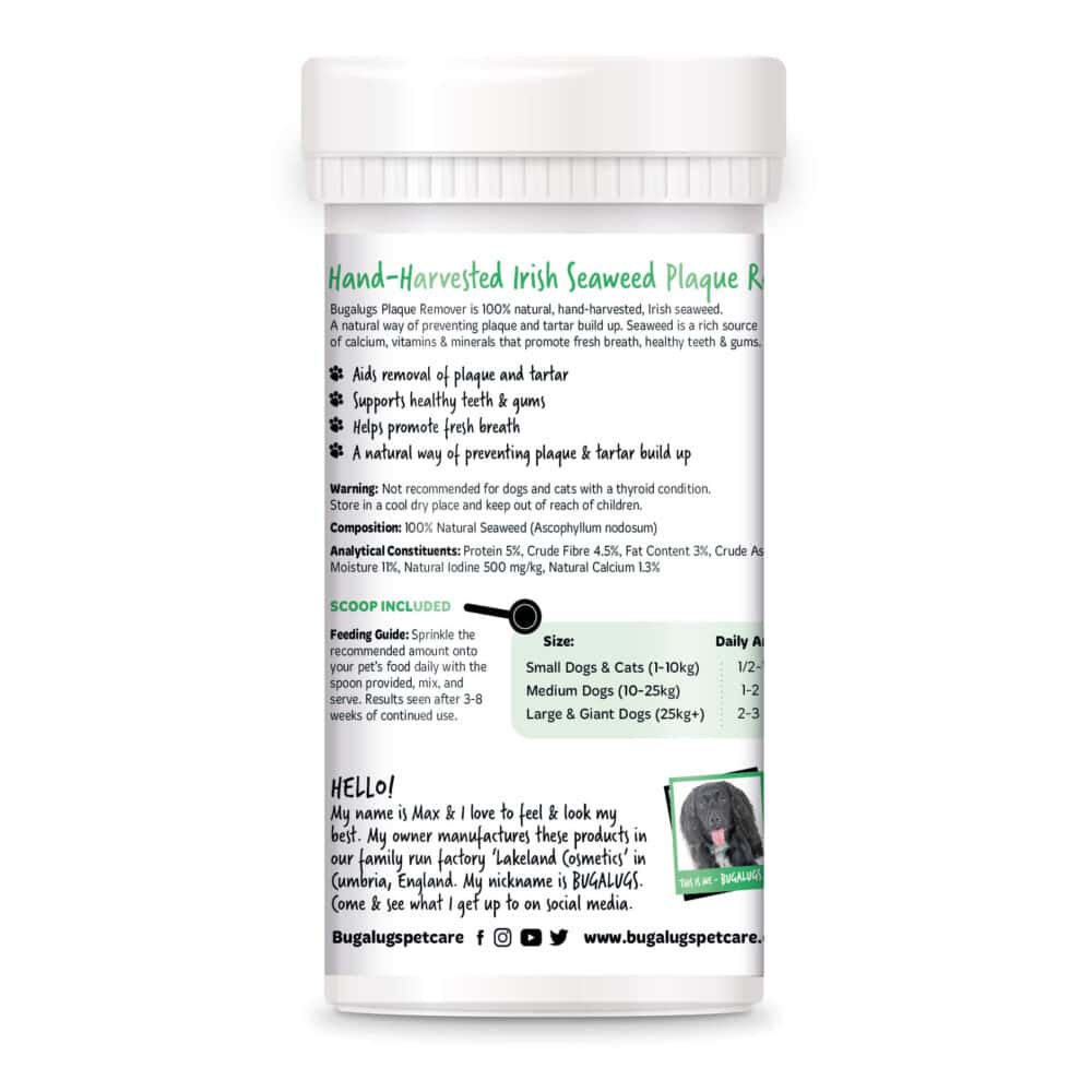 Bugalugs Plaque Remover is made from 100% natural, hand-harvested Irish seaweed. This natural supplement helps prevent plaque and tartar build-up while supporting fresh breath, healthy teeth, and strong gums. Rich in calcium, vitamins, and minerals, it provides essential nutrients for your dog’s oral health and overall wellbeing. Suitable for daily use and all breeds.