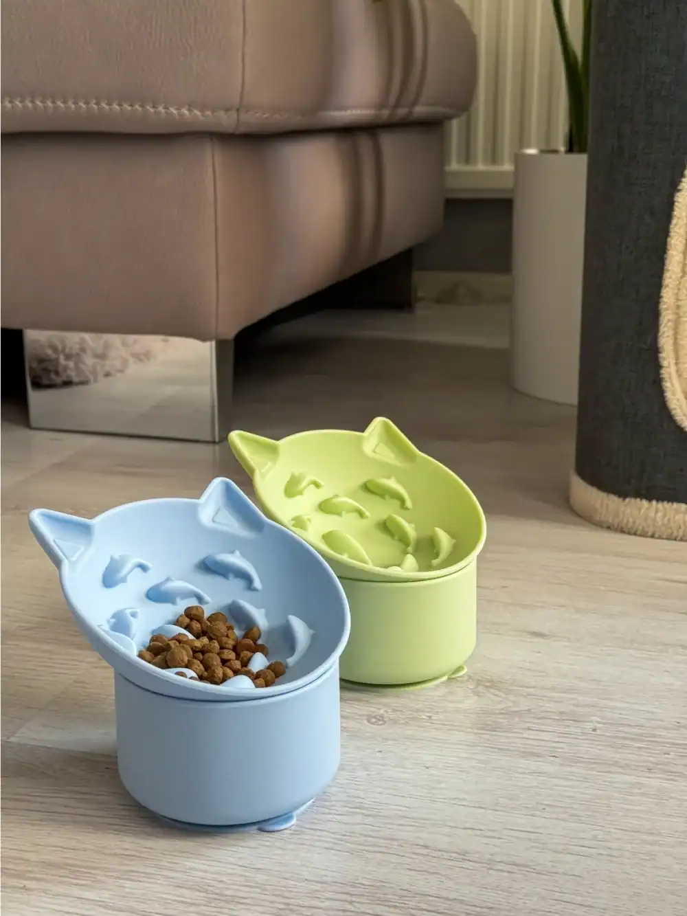 The removable top allows the bowl angle to be adjusted to your cat’s preferred feeding position, promoting better posture and reducing strain on the neck and whiskers. The lightweight yet stable design ensures comfortable everyday use. The lower compartment is a practical storage container for kibble, keeping food fresh and conveniently close at hand.