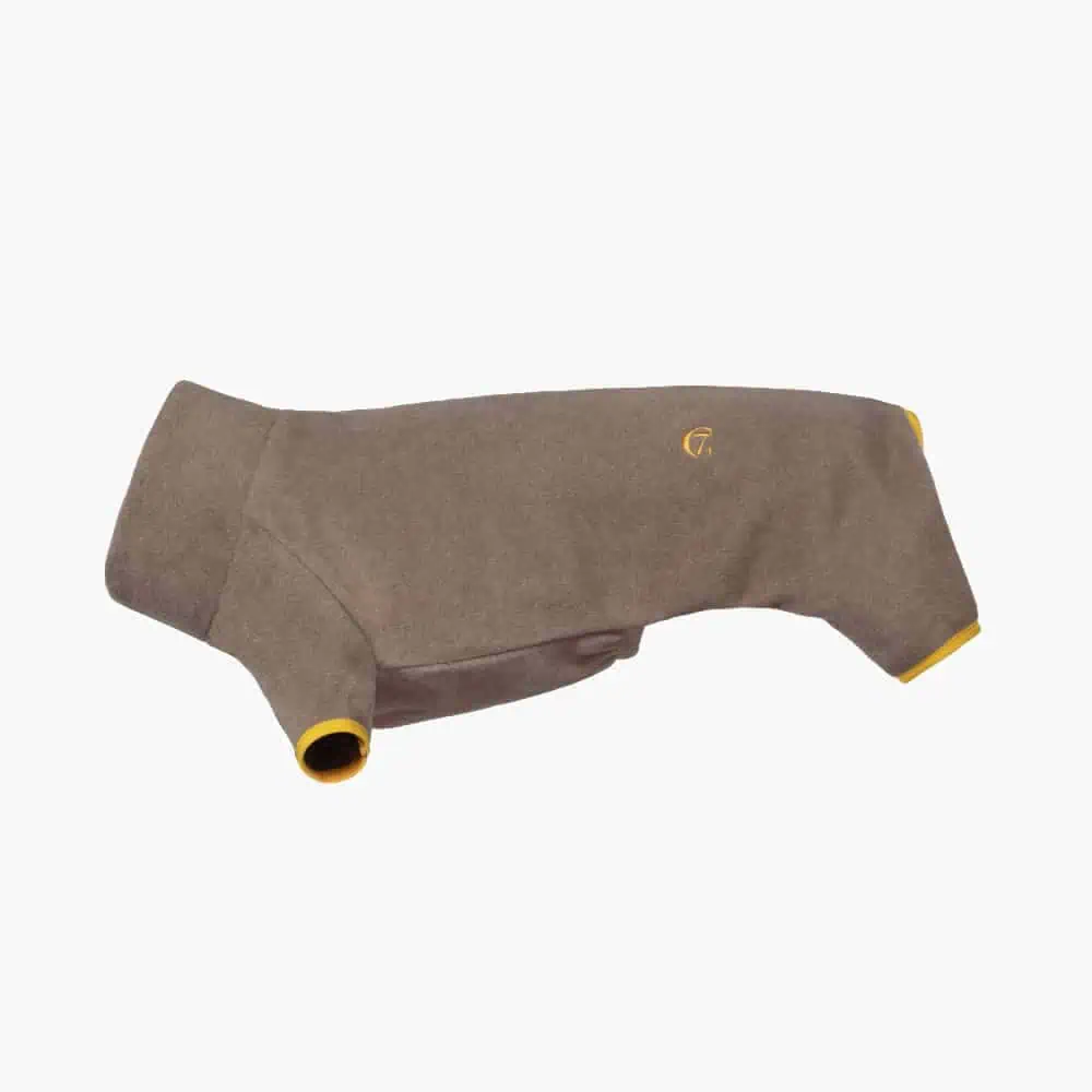 Warm fleece sweater for dachshunds in toffee that also covers the legs.
