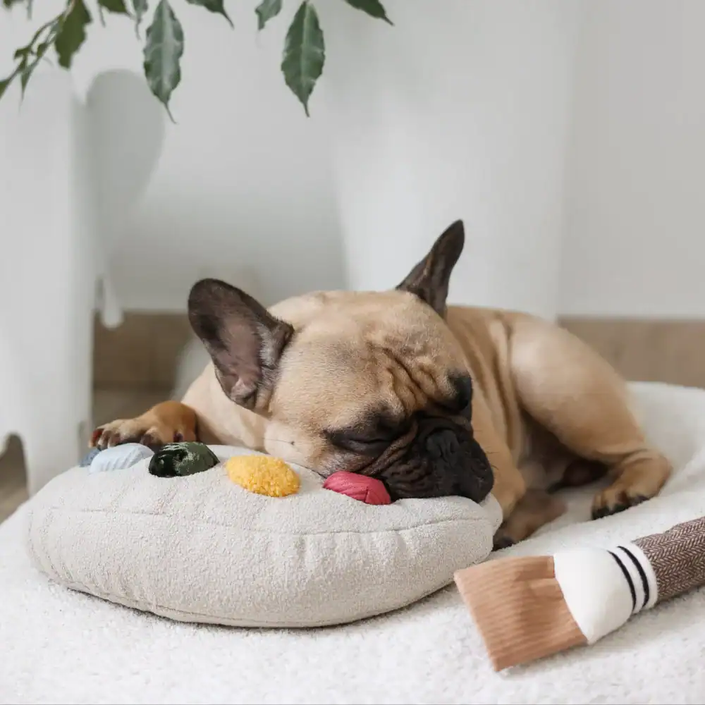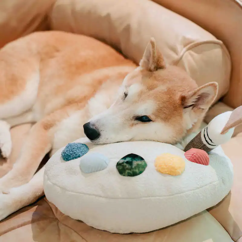 Turn playtime into a masterpiece with the Color Palette Dog Toy Set. This creative combo features a plush, headrest-style palette cushion made with reinforced fabric for chewing, lounging, and snuggles, paired with a squeaky paintbrush that sparks endless fun.