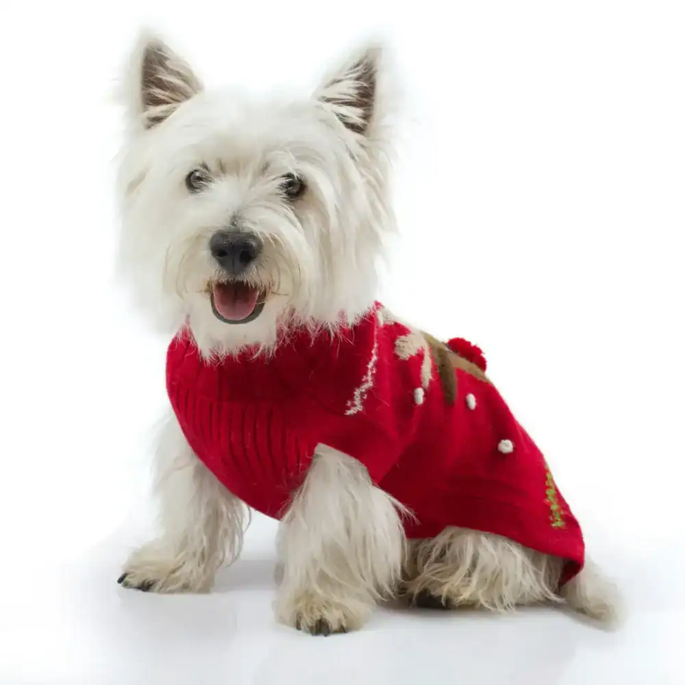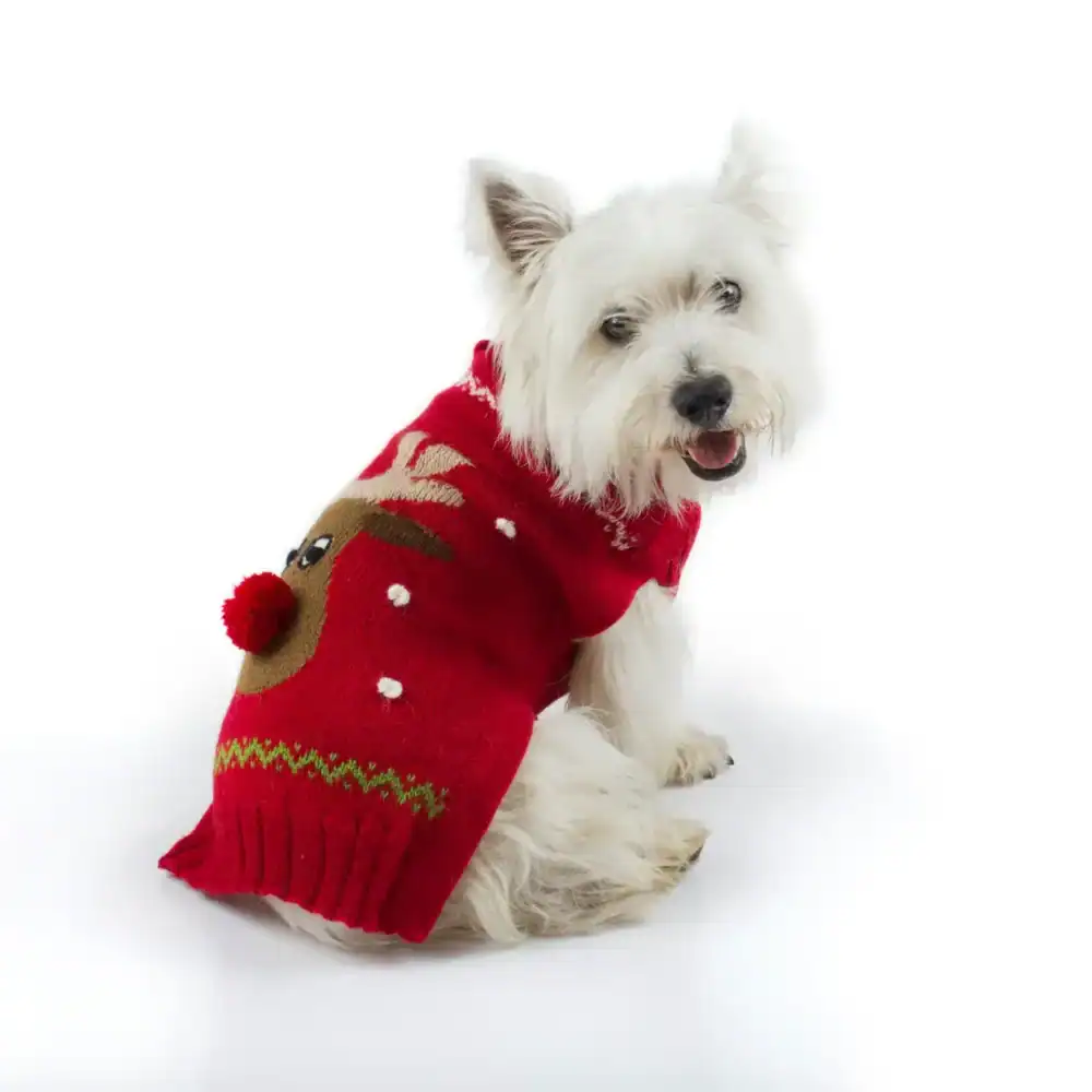 Brighten up the Holidays with this irresistibly soft and cozy alpaca-blend Rudolph sweater, designed especially for the stylish canine. Handcrafted with an intricate intarsia-knit pattern, this festive piece features an adorable Rudolph design complete with a playful pom-pom red nose—the perfect touch for cheerful winter walks and seasonal photos.