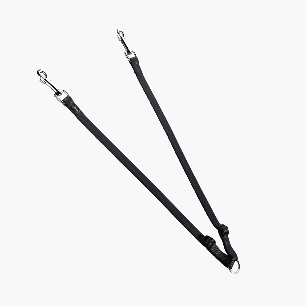 Features two individually adjustable straps with sturdy snap hooks that attach to each dog’s collar, and a central ring for leash connection.