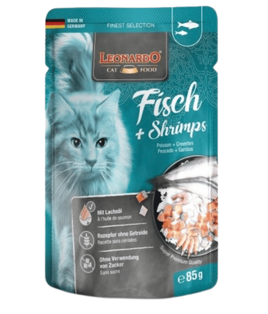 More from the sea: This balanced recipe, made with herring, salmon, and shrimp, is a truly special treat. Fish provides high-quality proteins and is rich in Omega-3 fatty acids to support a vital, healthy life for cats. Enhanced with tender shrimp, LEONARDO Fish + Shrimps is not only delicious but also packed with valuable nutrients. Salmon oil promotes a shiny coat and helps maintain a strong, muscular physique.