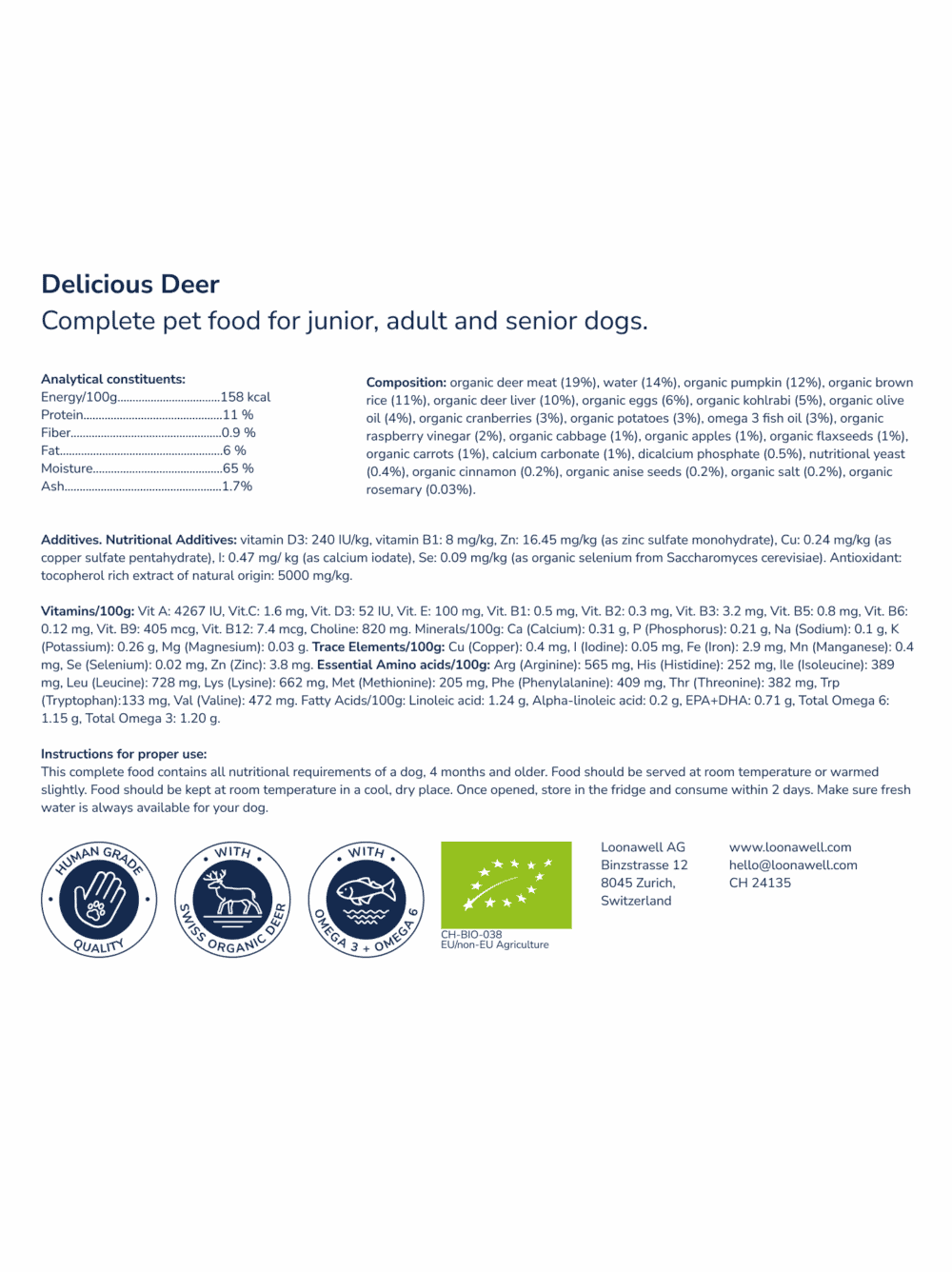 Loonawell uses Swiss organic venison — a lean, highly digestible red meat rich in iron and B vitamins. Naturally low in fat yet full of flavor, it’s a nourishing, premium choice that supports your dog’s health while delighting their palate.