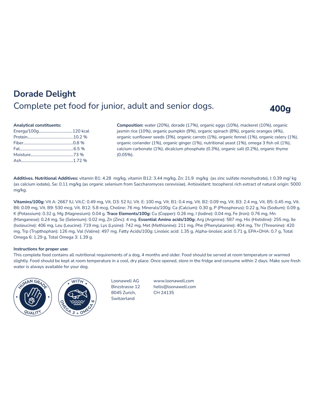 Dorade Delight is a light, lean, and omega-rich recipe crafted with the finest Swiss dorade fillet — a white fish prized for its delicate flavor, gentle aroma, and high digestibility. It’s the perfect choice for dogs with sensitivities or those who simply prefer the taste of fish over red meats.