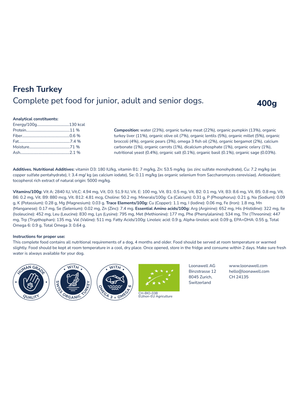 A curated blend of premium organic ingredients designed to elevate your pet’s dietary regimen. Handcrafted, featuring Swiss organic turkey meat as the core ingredient, complemented by nutrient-rich pumpkin and turkey liver for optimal protein intake.