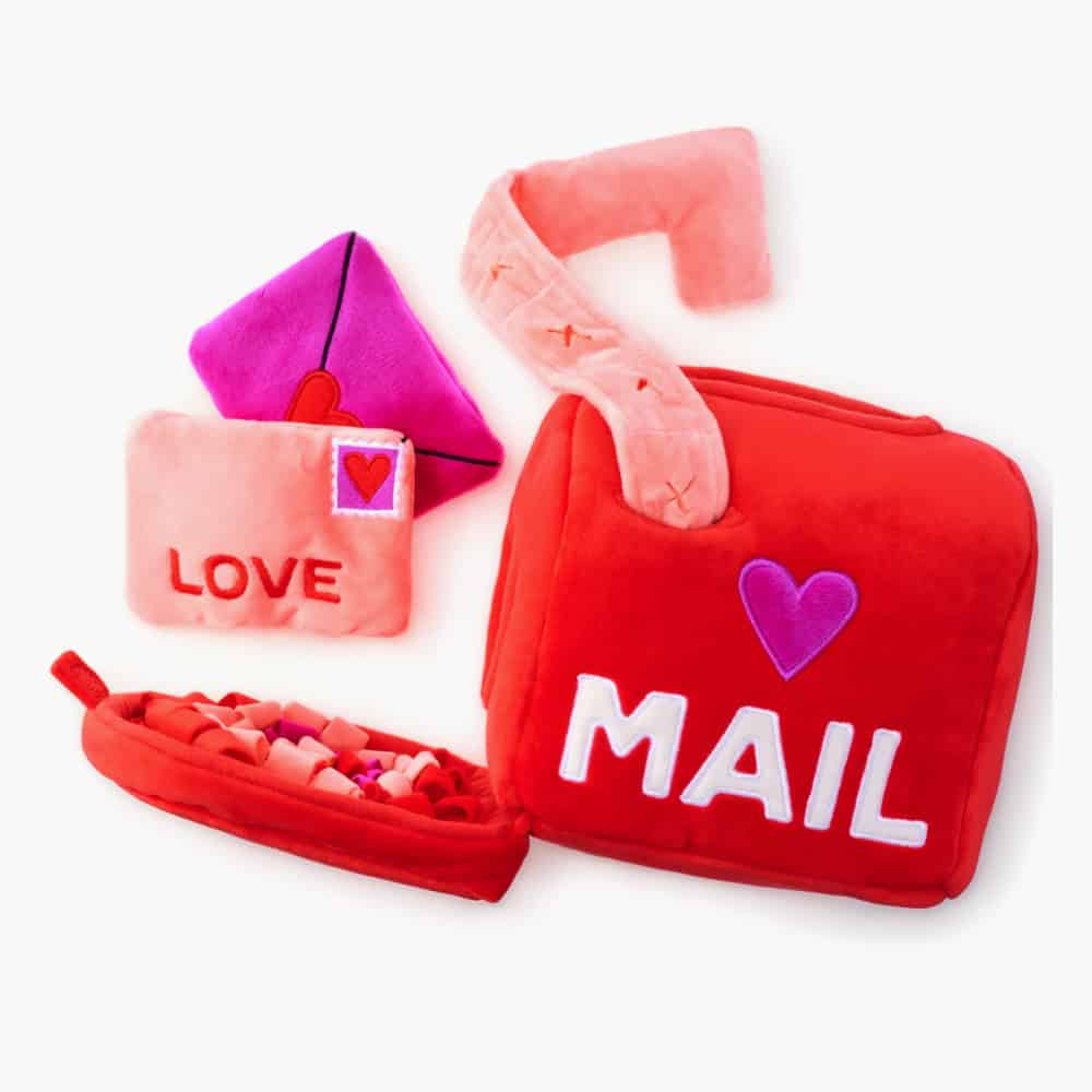 This plush mailbox toy is designed for enrichment and sensory play.