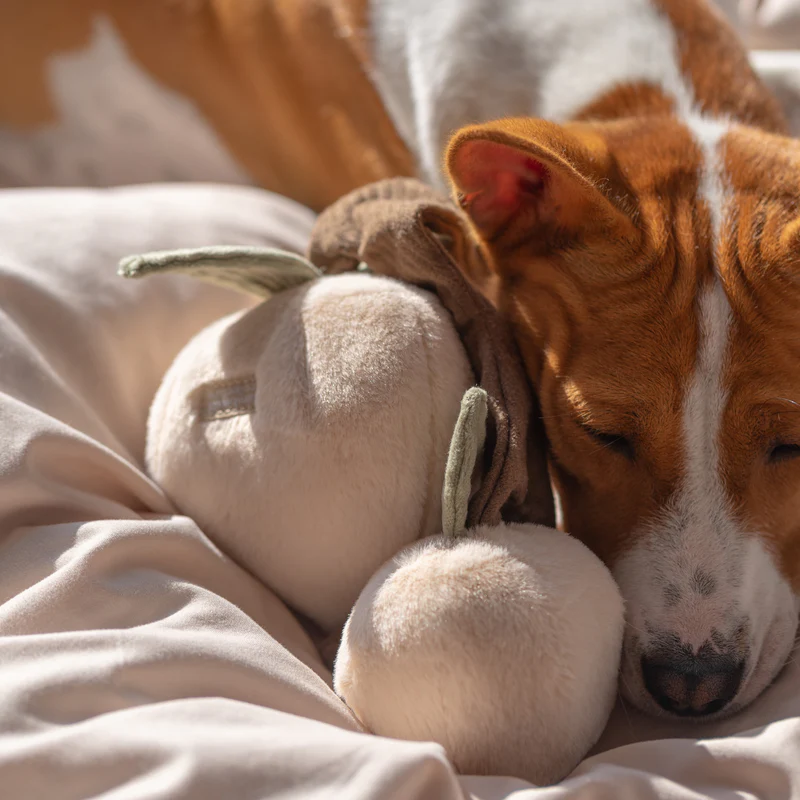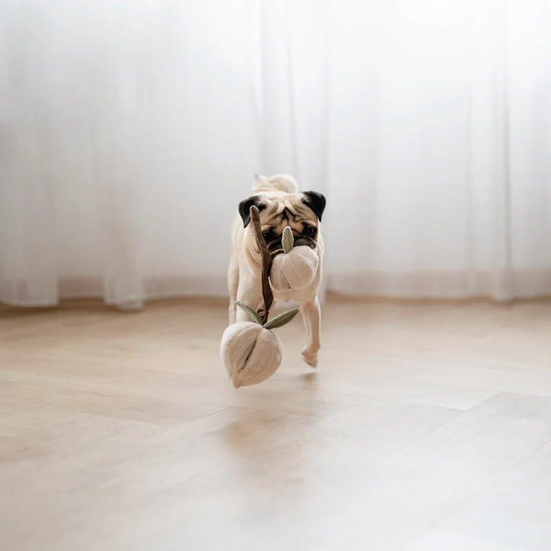 Snuffle Momo peaches features 1 large + 1 small treat pockets in two peaches that open sideways as the snoot make its way in! The branch crinkles and connects the two peaches loosely for those who loves to shake while playing. Squeakers are added inside for extra fun.