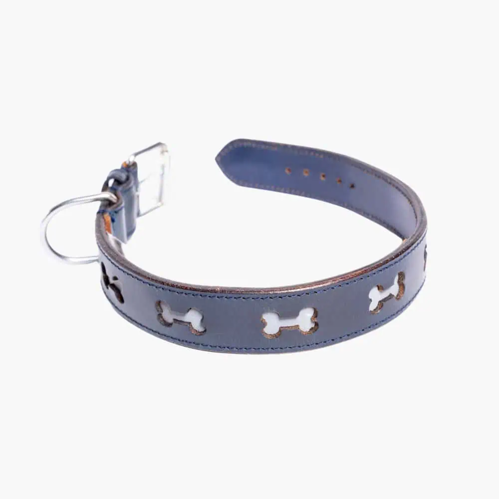 Chic meets safety with this vegan leather collar, featuring reflective bone-shaped elements for style and visibility. Crafted with vegetable tanning for gentle comfort, reinforced stitching ensures durability and elegance.