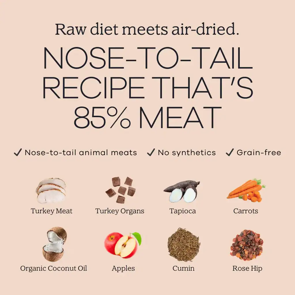 • Non-GMO Ingredients: 85% fresh turkey (meat, neck, liver, heart, gizzard, cartilage), tapioca, beet fiber, brewer’s yeast, carrots, apples, wild caught fish oil, coconut oil, cumin, thyme, rose hip.