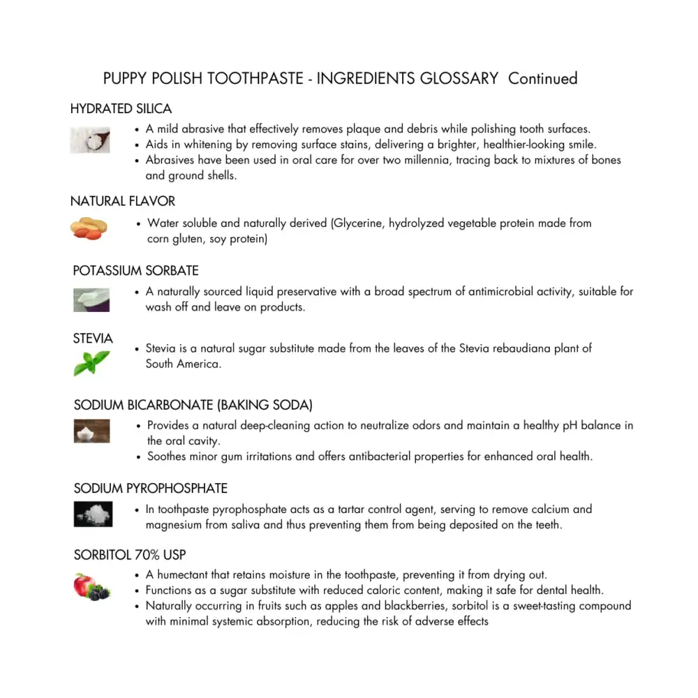 Purified Water, Calcium Carbonate (Limestone Abrasive), Sorbitol, Hydrated Silica, Pet Safe Peanut Flavor, Coco Glucoside (Coconut Oil Derived), Sodium Bicarbonate (Baking Soda), Cellulose Gum, Xanthan Gum, Sodium Pyrophosphate, Cocos Nucifera (Coconut) Oil, Potassium Sorbate, Cymenol, Stevia Rebaudiana.