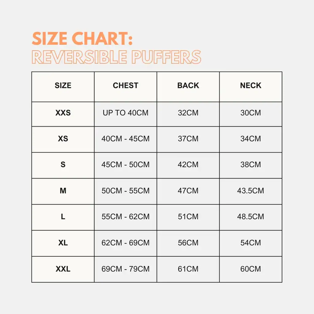 Reversible Dog Puffer Jacket it’s just what your dog needs to keep it warm through winter. Designed with recycled stuffing and padding, this sleeveless dog gilet is both water and wind resistant, and will keep your pup cosy when the colder temperatures arrive!