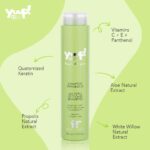 Quaternized Keratin, Vitamins C + E + Panthenol, extracts of Aloe, White Willow and Propolis.